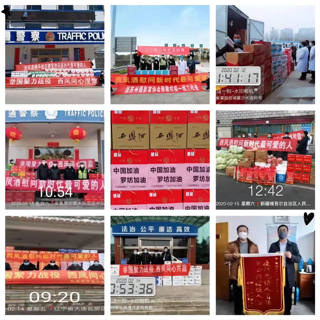 為了支持抗擊疫情,向奮戰在一線的醫生、護士、解放軍戰士等新時代“最可愛的人”致敬,西鳳公司發動“致敬新時代最可愛的人”公益捐贈活動,廣東、東北、河南、甘寧、川鄂、湘贛、新疆、山東等地分公司及經銷商積極響應,先后為全國300多個城市的醫生護士、公安交警、解放軍戰士、學生教師、環衛工人等送去了抗疫物資及生活必需品。